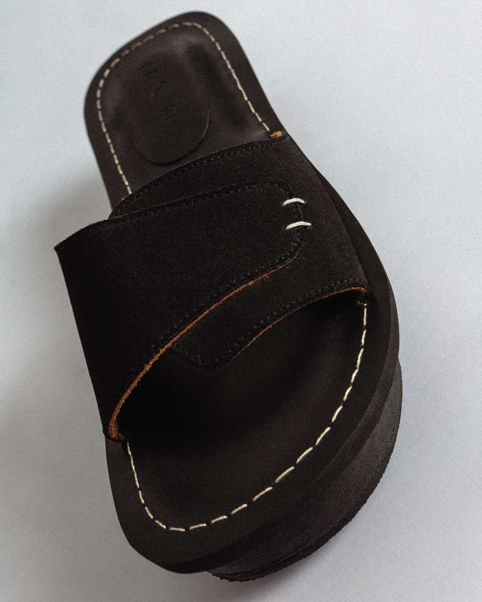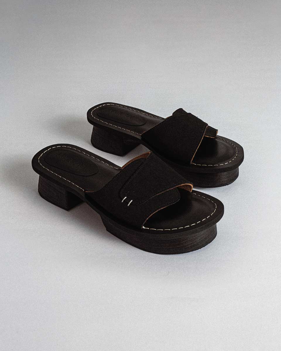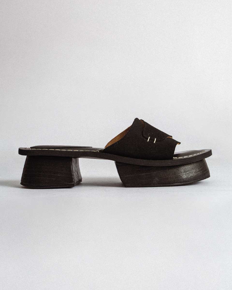 A bakiak-inspired sandal elevated with a high wooden platform wrapped in stacked leather strips. Designed with a split platform heel for an elevated silhouette. The insole is finished with bold white stitch detailing, while the upper—crafted from genuine red suede—features two subtle stitch lines. A statement piece that blends traditional shape with modern refinement.