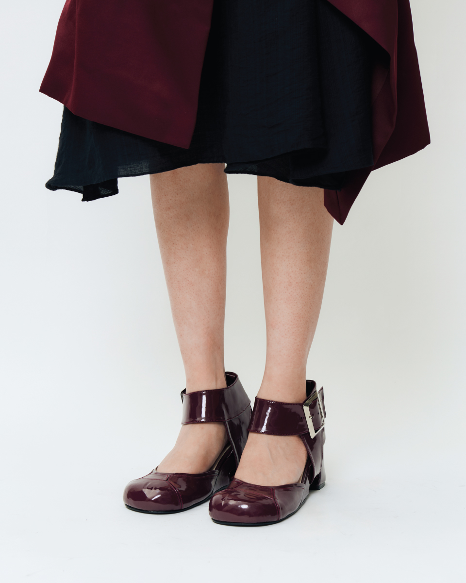 A patent leather heel in cherry wine, designed with interchangeable ankle straps—a slim strap for a clean look or a wide belt for a bold statement—finished with a distinctive dome-shaped heel and stitch detailing on the front upper.