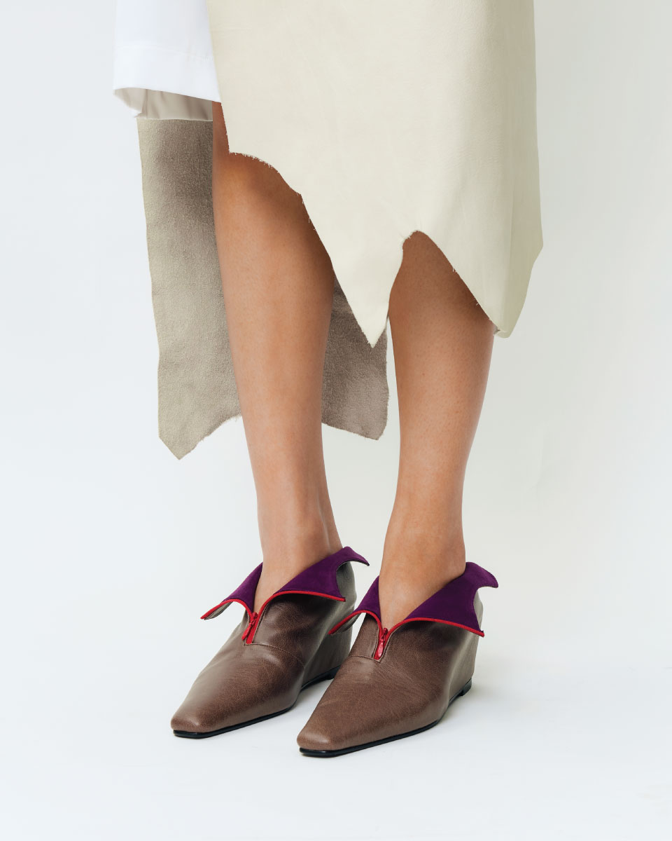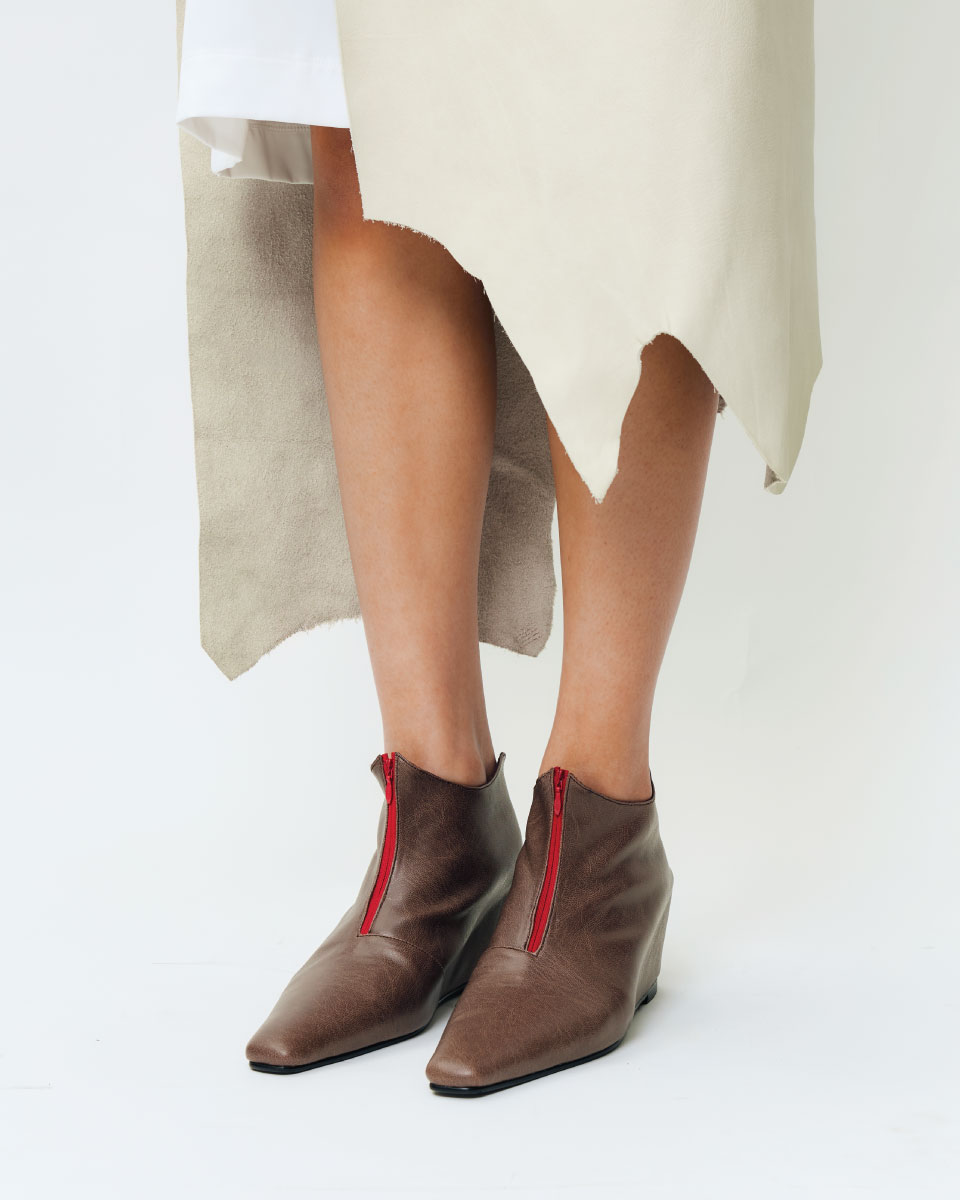 Ankle boots in mud-toned leather with a purple inner lining, featuring a hidden heel and semi-pointed toe. Designed with a versatile zip closure that can be worn fully up for a sleek finish or halfway down to create a folded collar effect.