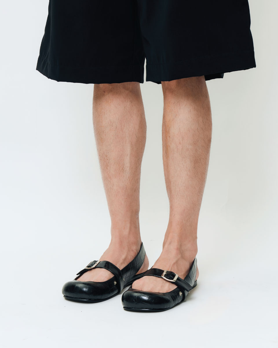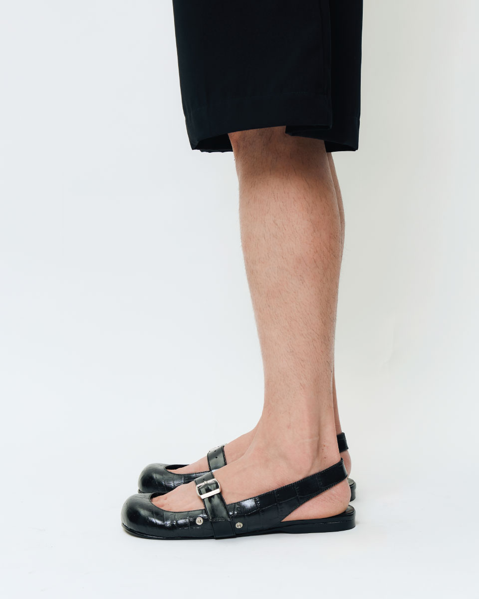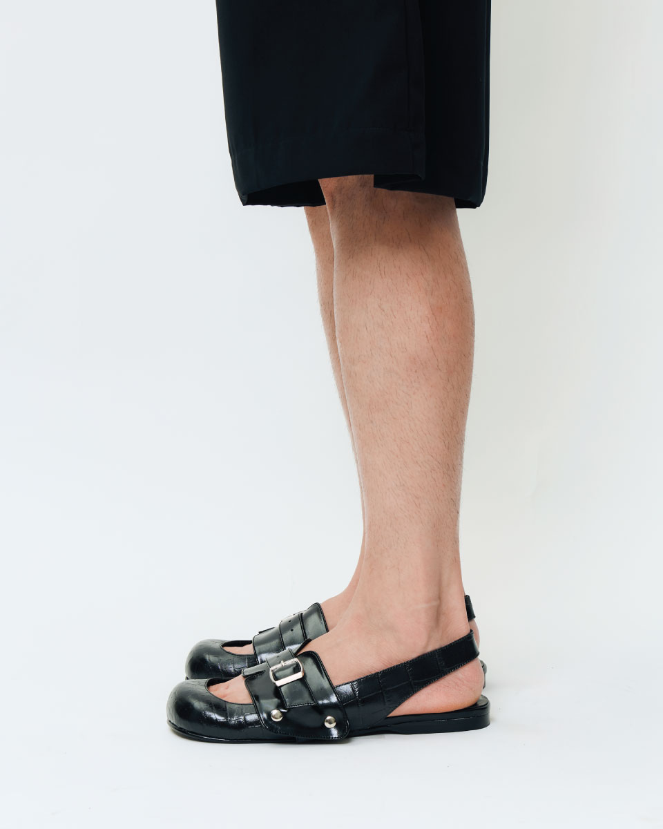 Rounded-toe flat shoes in black leather with a croc finish, featuring a detachable upper fastened with belts. Can also be worn without the upper, styled with only the slim belt for a more open, minimal look.