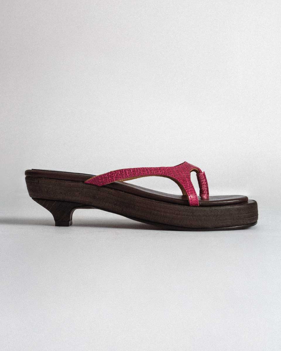 A refined kitten-heel silhouette, grounded with a thick wooden platform wrapped in stacked leather strips for a bolder finish, completed with a rounded-square sole. The upper is crafted from genuine leather in a Fuchsia tone, contrasted with a dark brown synthetic leather insole. A modern balance of height, color, and texture.