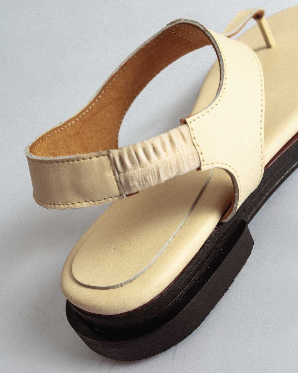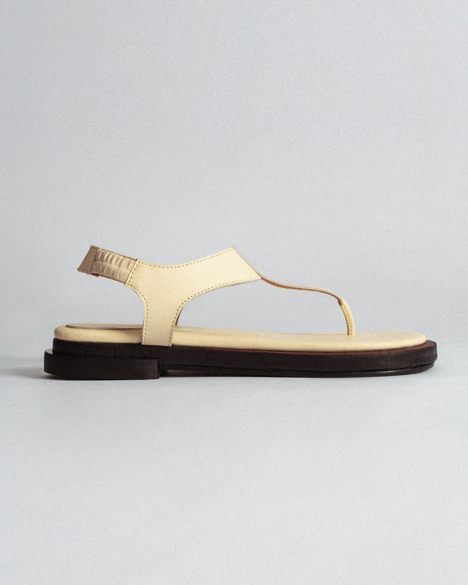A slingback thong sandal in butter nappa leather, lined with genuine suede for lasting comfort. Designed with a round-shaped sole, finished with stacked leather strips along the platform and an overlapping heel detail—soft curves meeting a structured, squared silhouette.